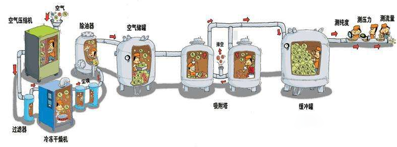 吸附塔里的碳分子筛在工作的时候,其实是在不断地进行吸附和解吸,这个过程我们可以形象地理解为分子筛在"呼吸"。当气流以较高速度通过分子筛床层的时候,会产生类似于沙沙声的噪音,特别是在设备刚启动或者工况不稳定的时候,这种声音会更加明显。