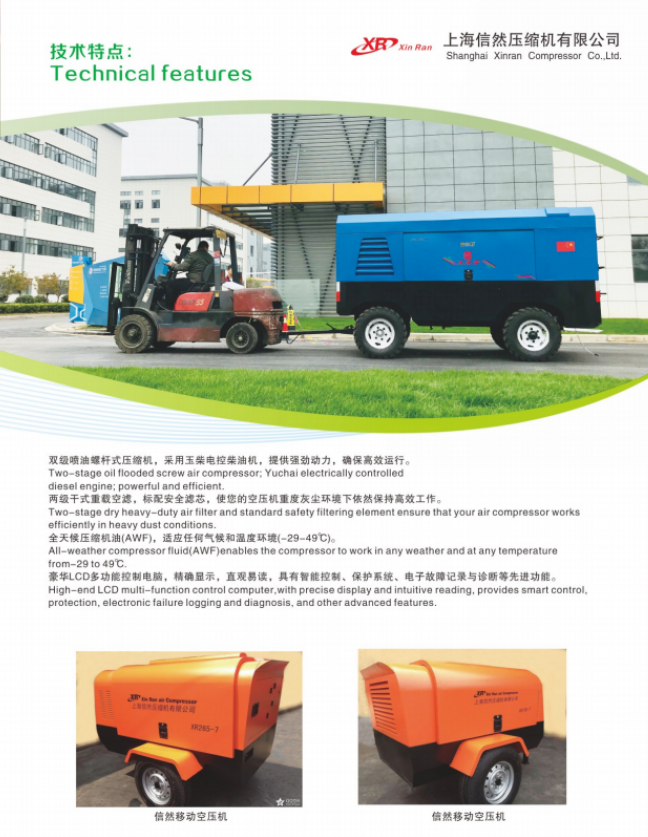 上海信然压缩机有限公司专业从事空压机的设计、研究、生产。信然空压机主要产品包括:中高压活塞式空压机、固定螺杆式空压机、移动螺杆式空压机、螺杆活塞复合式压缩机、无油螺杆空压机、防爆空压机、离心式压缩机、潜孔钻车、空气干燥机、精密过滤器、储气罐、气动工具等,被广泛运用于各行各业。