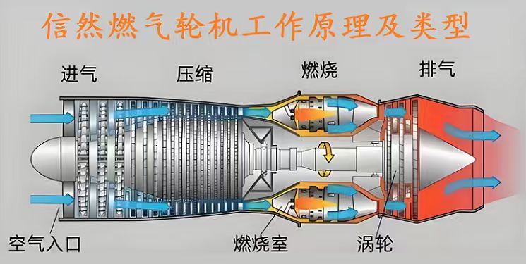 信然燃气轮机的工作过程是,压气机(即压缩机)连续地从大气中吸入空气并将其压缩;压缩后的空气进入燃烧室,与喷入的燃料混合后燃烧,成为高温燃气,随即流入燃气涡轮中膨胀做功,推动涡轮叶轮带着压气机叶轮一起旋转;加热后的高温燃气的做功能力显著提高,因而燃气涡轮在带动压气机的同时,尚有余功作为燃气轮机的输出机械功。燃气轮机由静止起动时,需用起动机带着旋转,待加速到能独立运行后,起动机才脱开。